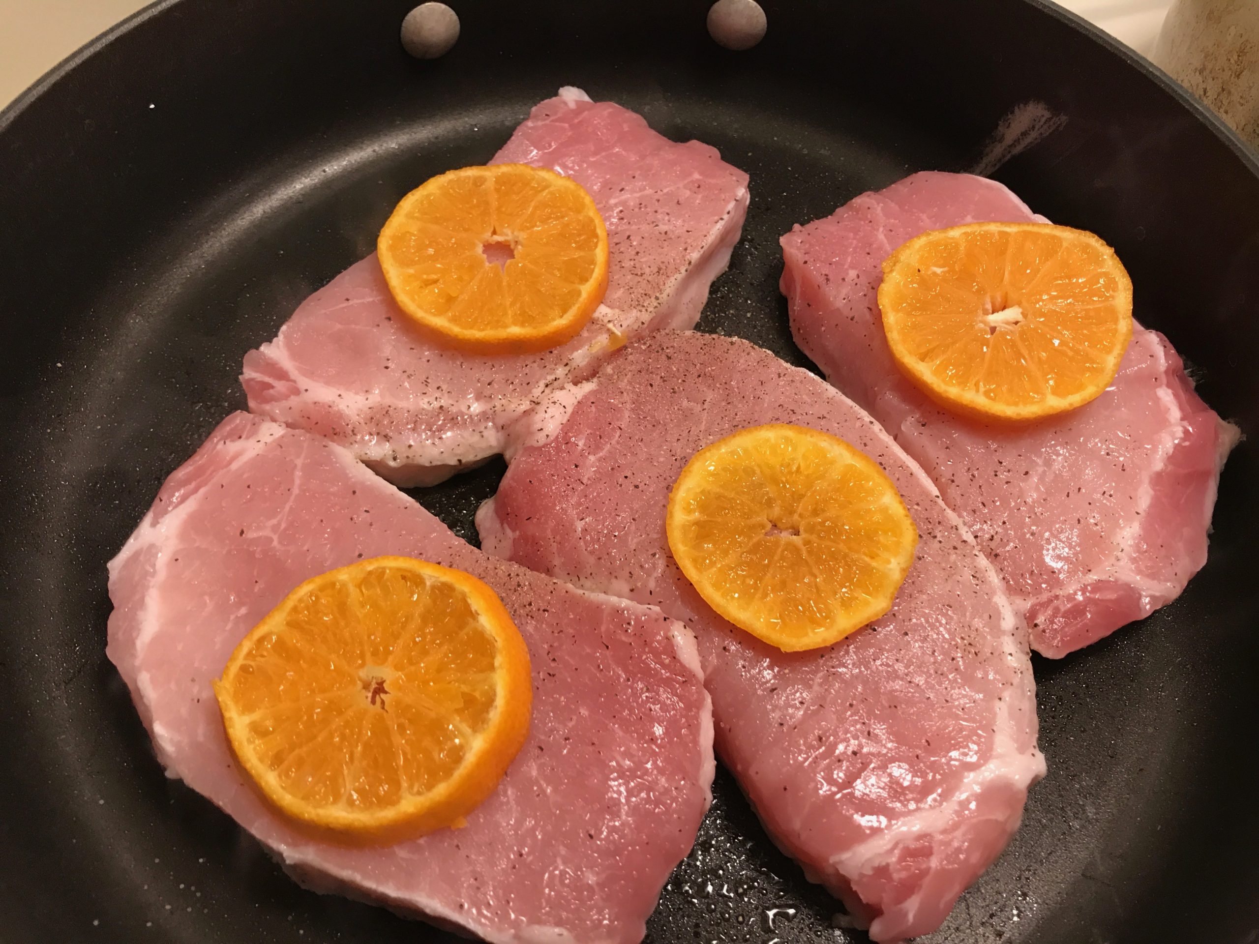 - Add pork to the pan. Top each pork chop with 1 orange slice. Cover and let cook 4-5 minutes. Flip the pork over, putting the orange slice back on top.