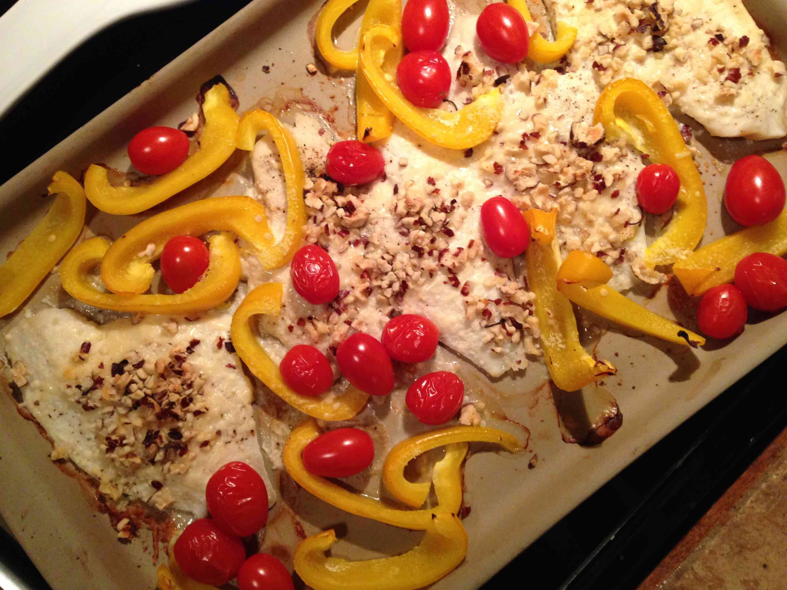 • Add yellow pepper and cherry tomatoes to the pan, surrounding the fish. Roast for 18-20 minutes or until fish is flakey and veggies are roasted.
